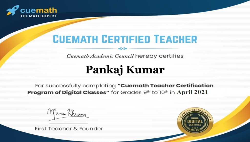 Rough Explore What Its Like Real Classes By REAL teacher live, No Recorded Classes SAVE Parents Time(and efforts) in Trial and error Teaching Themselves Focussed ATTENTION, better than School or Big tuitions Past Class BASICS Revision Certifications & Tutor Upskilling Pankaj_cuemath_certificate.webp 2015.png 2014.png INTERNATIONAL TUTOR CERTIFICATION TOP TUTOR URBANPRO TOP TUTOR URBANPRO
